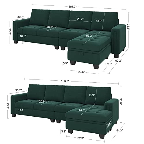 - SUITABLE DIMENSIONS: Overall dimensions of L shaped sectional couch is 106.7″(W) x 62.2″(D) x 35.8″(H). Dimensions of single storage ottoman is 23.6″(W) x 32.3″(D) x18.5″(H) . Space saving and durable.Belffin has an excellent after-sale service team, please feel free to contact us if you have any questions. We are glad to serve you.