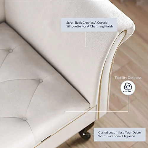 - [PLUSH FEEL] This accent sofa is upholstered in soft velvet and accented with tufted buttons, creating a cozy feel and a vintage-style aesthetic.