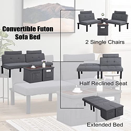 Will a multifunctional futon sofa bed make your heart beat? Convertible tufted futon sofa bed with Storage Ottoman Footstool or coffee table and 2 lumbar pillows. many combinations to meet your various needs. Features: This is a set of 2 sofa bed chairs, 1 footstool or ottoman can change to be coffee table, 2 lumar pillows. The cover of the footstool has two functions: the fabric side can be used as a footstool or ottoman, the wood side can be used as a small coffee table, and it also has a storage function.