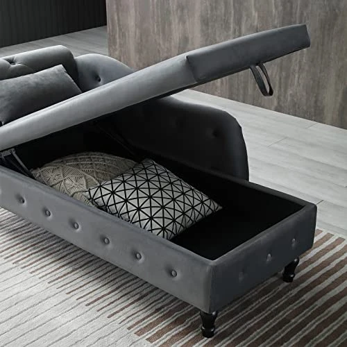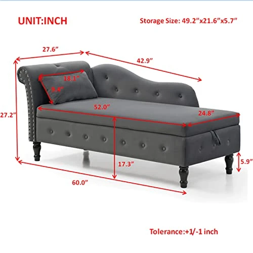 - 【Easy to assemble】 – overall size: 60 “W x 27.6 “D x 27.2 “H, seat size: 52”W x 24.8”D x 17.3 “H, storage size: 49.2 “W x 21.6 “D x 5.7” H. This velvet chaise lounge requires only a small amount of assembly as per our instructions. If you have any questions, please feel free to contact us and we will provide you with 24-hour pre-sales and after-sales service.