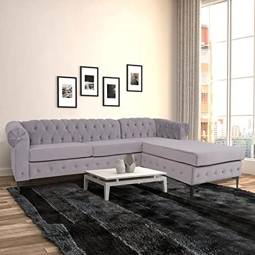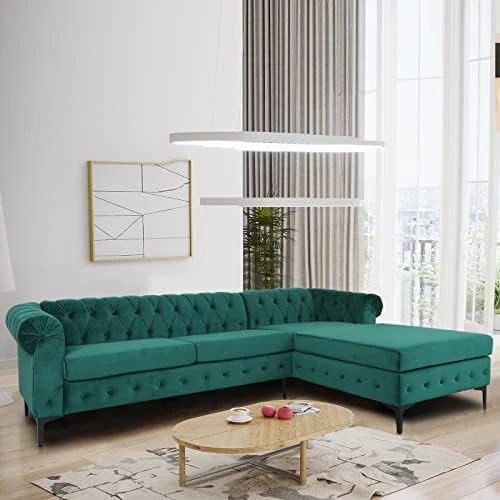 - MULTFUNCTIONAL COUCH: You can enjoy a cup of coffee or a read a book in the daytime, or have a good sleep at night, This L-shaped sectional couch with chaise lounge will create more opportunities for happy and relaxing times. With the deep button trufted velvet sofa, You ou can get a fantastic addition to your home for different purposes.