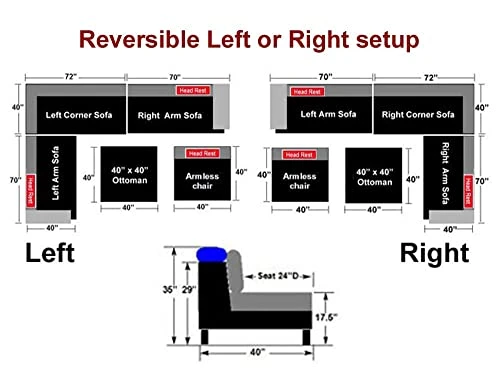 - Set includes: Left Sofa + Reversible Corner Sofa + Right Sofa + Armless Chair + Ottoman and all 13 pillows (8 large back resting pillows and 5 small accent pillows)