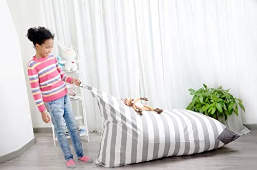 - STYLISH DESIGN – The beautiful grey and white stripe looks beautiful with every decor. The triangle shape is not only stylish but the backrest makes this the most cozy plush toy storage out there.